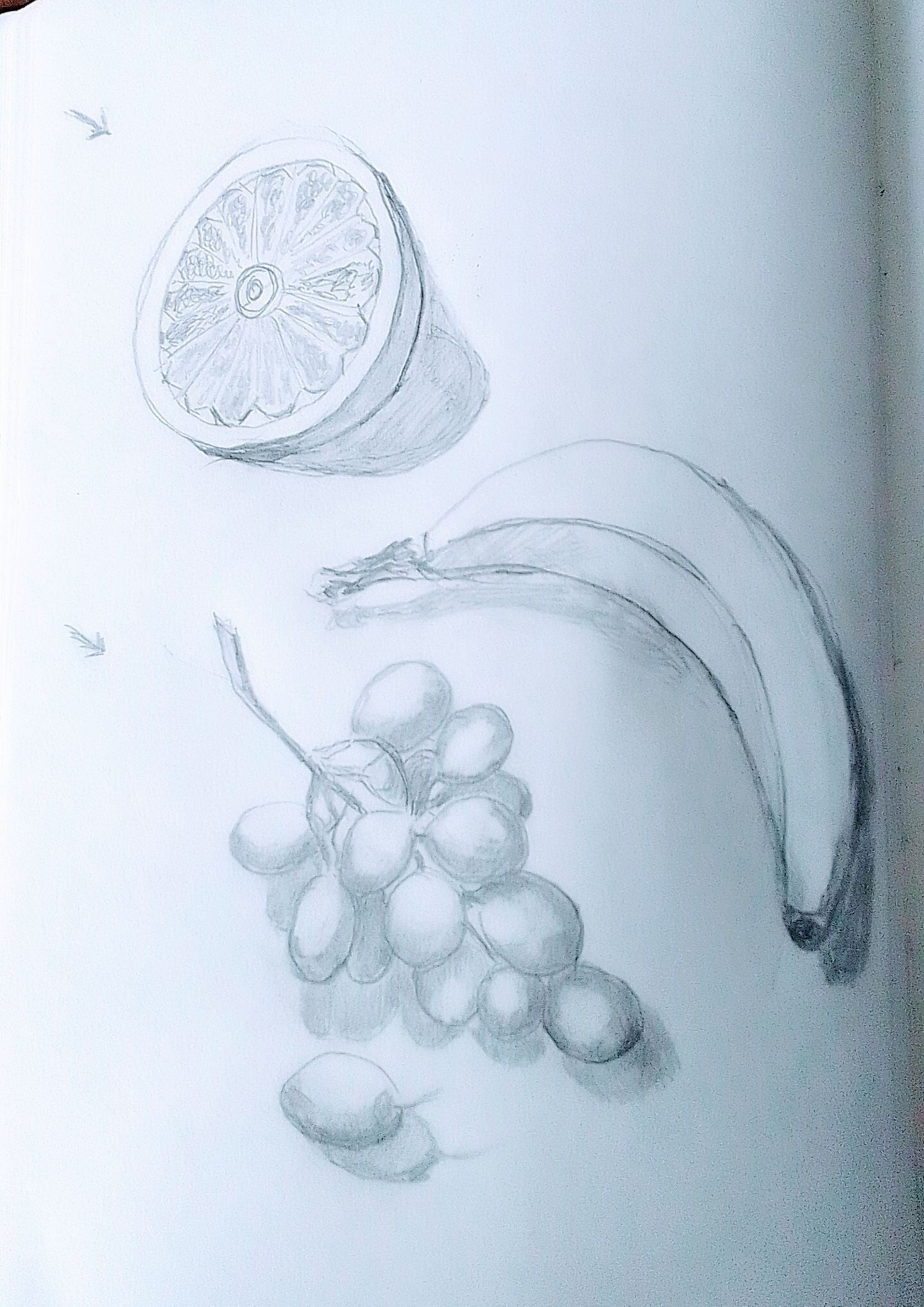 Grundformen, Schraffuren, einfache Motive wie Obst, Blumen, Gegenstände mit Licht und Schatten.